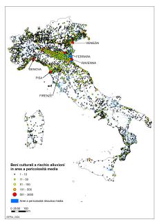 I beni culturali a rischio frane sono 45.339, dei quali 13.966 sono ubicati in aree a pericolosità elevata P3 e molto elevata P4. I beni culturali a rischio alluvioni sono 35.997 nello scenario di pericolosità idraulica media (tempi di ritorno fra 100 e 200 anni) e raggiungono i 54.103 nello scenario di pericolosità idraulica bassa, che è lo scenario massimo atteso.