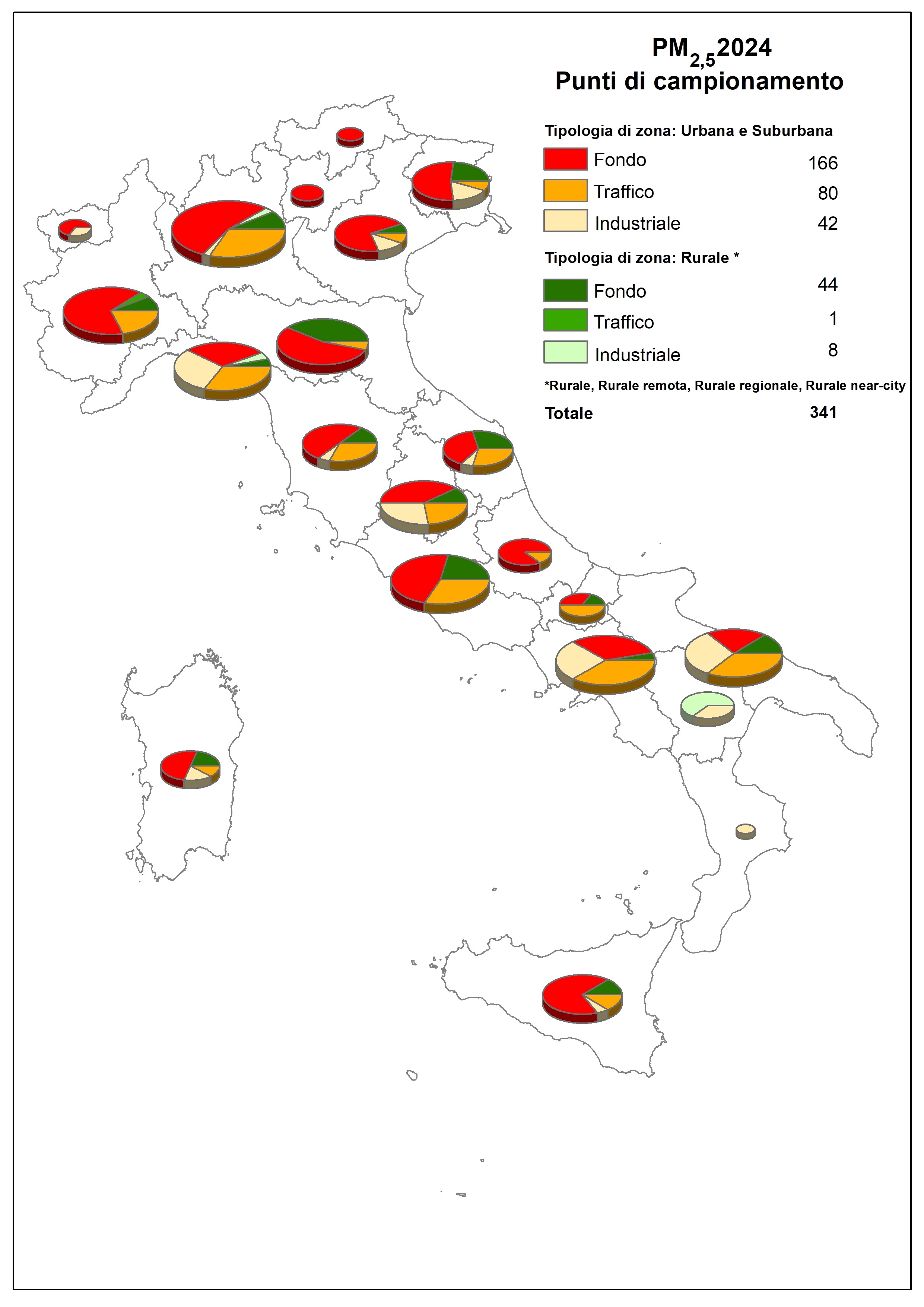 Le stazioni di monitoraggio che hanno misurato e comunicato dati di PM2,5 sono 341. Di queste, 307 (90,0% del totale) hanno copertura temporale minima del 90% (al netto delle perdite di dati dovute alla taratura periodica o alla manutenzione ordinaria) (Tabella 1). La classificazione delle stazioni di monitoraggio di PM2,5 secondo i criteri di ubicazione su macroscala previsti dalla normativa è rappresentata in Figura 1. Il valore limite annuale (25 µg/m³), non è stato superato in nessun caso. Il valore di riferimento OMS annuale (5 µg/m³) è stato superato in 300 stazioni (97,7% dei casi) (Figura 2).