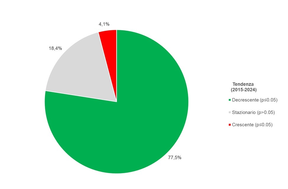 L’analisi statistica dei trend (2015-2024) è stata condotta con il metodo di Mann-Kendall corretto per la stagionalità. Implementare un metodo di destagionalizzazione permette di minimizzare l’effetto delle oscillazioni interannuali dovute alle differenze riscontrabili nei vari anni rispetto al ciclo stagionale medio, di evidenziare l’esistenza di una tendenza di fondo, di quantificare la sua significatività statistica
