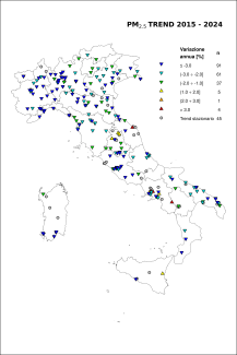 Per il PM2,5 si osserva un trend decrescente statisticamente significativo nel 77% dei casi (189 stazioni di monitoraggio su 244), con variazione annuale media stimata: -0,6 µg/m³y [-1,8 µg/m³y ÷ -0,1 µg/m³y]). Sulla porzione di campione considerato per il quale è stato individuato un trend decrescente statisticamente significativo si osserva una riduzione media annuale del 3,1% (-8,2% ÷ -1,0%) (Tabella 3, Figure 3 e 4).
