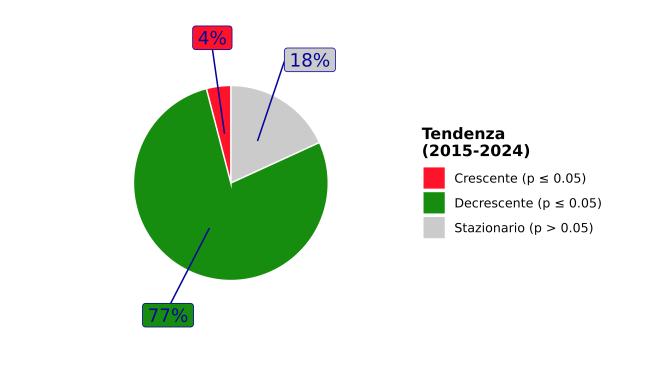 L’analisi statistica dei trend (2014-2023) è stata condotta con il metodo di Mann-Kendall corretto per la stagionalità. Implementare un metodo di destagionalizzazione permette di minimizzare l’effetto delle oscillazioni interannuali dovute alle differenze riscontrabili nei vari anni rispetto al ciclo stagionale medio, di evidenziare l’esistenza di una tendenza di fondo, di quantificare la sua significatività statistica.