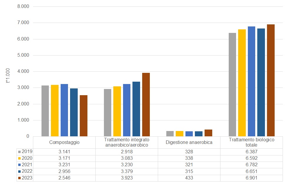 Negli ultimi anni si è assistito a un notevole incremento della raccolta differenziata dei rifiuti organici, anche se alcune aree non raggiungono ancora livelli ottimali. Tale tendenza ha favorito un significativo sviluppo nel settore del trattamento biologico che si è evoluto attraverso l’adozione di tecnologie impiantistiche innovative. Accanto ai sistemi tradizionali di trattamento aerobico volti alla produzione di ammendanti da utilizzare in agricoltura, il sistema impiantistico nazionale, anche attraverso la riconversione di impianti esistenti, si sta dotando, negli anni, dei sistemi integrati che uniscono tale modalità di trattamento alla digestione anaerobica, abbinando, quindi, il recupero di materia a quello di energia, contenendo le emissioni e utilizzando, infine, il biogas generato e purificato, per la produzione di energia e biometano.