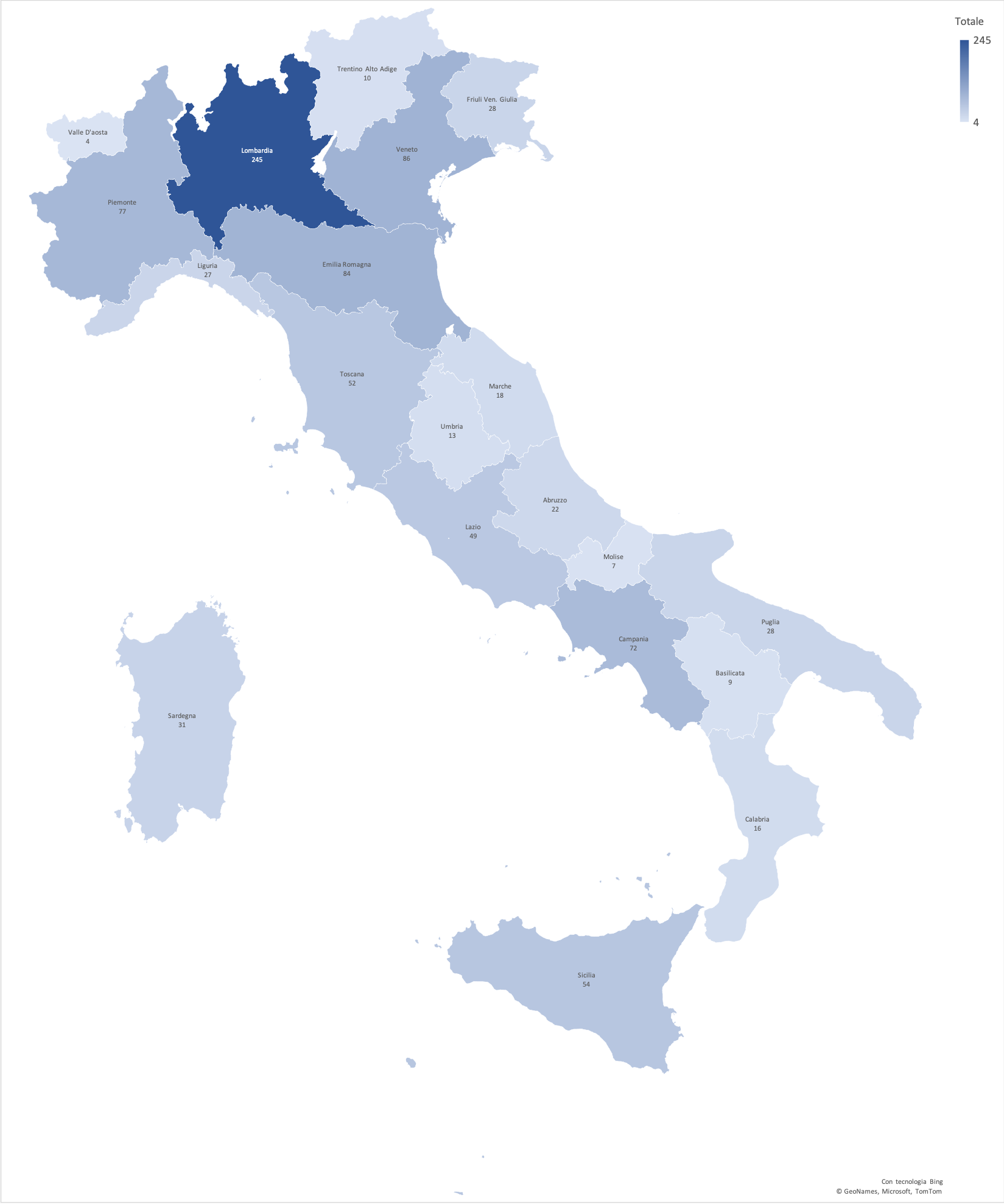 Nella Tabella 1, con riferimento alle informazioni aggiornate a 30 giugno 2025, è sintetizzata la distribuzione sul territorio nazionale degli stabilimenti soggetti al D.Lgs. 105/2015, appartenenti alle diverse categorie (soglia superiore e soglia inferiore) e quindi agli obblighi di cui agli artt. 13 e 15, divisi per province e regioni. Relativamente alla distribuzione sul territorio nazionale degli stabilimenti notificati, circa un quarto è concentrato in Lombardia. Regioni con elevata presenza di industrie a rischio sono anche: Veneto, Emilia-Romagna e Piemonte (tutte al Nord e con 8-9% ciascuna). Si possono notare particolari concentrazioni di industrie in aree coincidenti per lo più con i poli petrolchimici (ex Enichem) e di raffinazione come Trecate (nel Novarese), Porto Marghera, Ferrara e Ravenna al Nord, Gela (CL), Augusta-Priolo-Melilli-(Siracusa) e Sarroch (CA). Concentrazioni importanti di industrie si trovano anche in corrispondenza di aree industriali nelle province di Milano, Bergamo, Brescia, Napoli, Venezia, Pavia, Alessandria, Vicenza. Negli ultimi tempi, complici la crisi economico-industriale globale e quella dell’industria petrolchimica in particolare, alcune delle suddette aree sono state parzialmente dismesse o sono in fase di trasformazione industriale (dove la chimica del petrolio si sta sostituendo con la chimica verde). Nella quasi totalità delle province italiane è ubicato almeno uno stabilimento a rischio di incidente rilevante, e quelle con un numero elevato di stabilimenti sono: - al Nord: Milano (59 stabilimenti), Bergamo (38), Brescia (37), Ravenna (35), Venezia (21), Pavia (20), Vicenza (20), Alessandria (20), Torino (19), Novara (19), Udine (19), Lodi (18), Monza e Brianza (17), Varese (17), Bologna (16), Genova (16), Verona (15), Cremona (13), Padova (12), Ferrara (11), Mantova (10). Al Centro: Roma (18), Frosinone (15), Livorno (13), Latina (10), Firenze (10). Al Sud e Isole: Napoli (34), Salerno (17), Siracusa (14),Cagliari (12), Catania (11), Caserta (10).