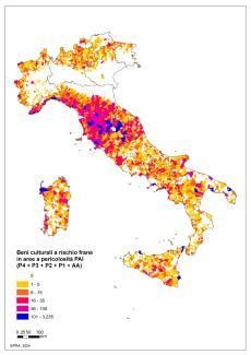 L’indicatore fornisce informazioni relative ai beni culturali a rischio idrogeologico sul territorio nazionale. I beni culturali a rischio frane sono 45.339, dei quali 13.966 sono ubicati in aree a pericolosità elevata P3 e molto elevata P4. I beni culturali a rischio alluvioni sono 35.997 nello scenario di pericolosità idraulica media (tempi di ritorno fra 100 e 200 anni) e raggiungono i 54.103 nello scenario di pericolosità idraulica bassa, che è lo scenario massimo atteso.