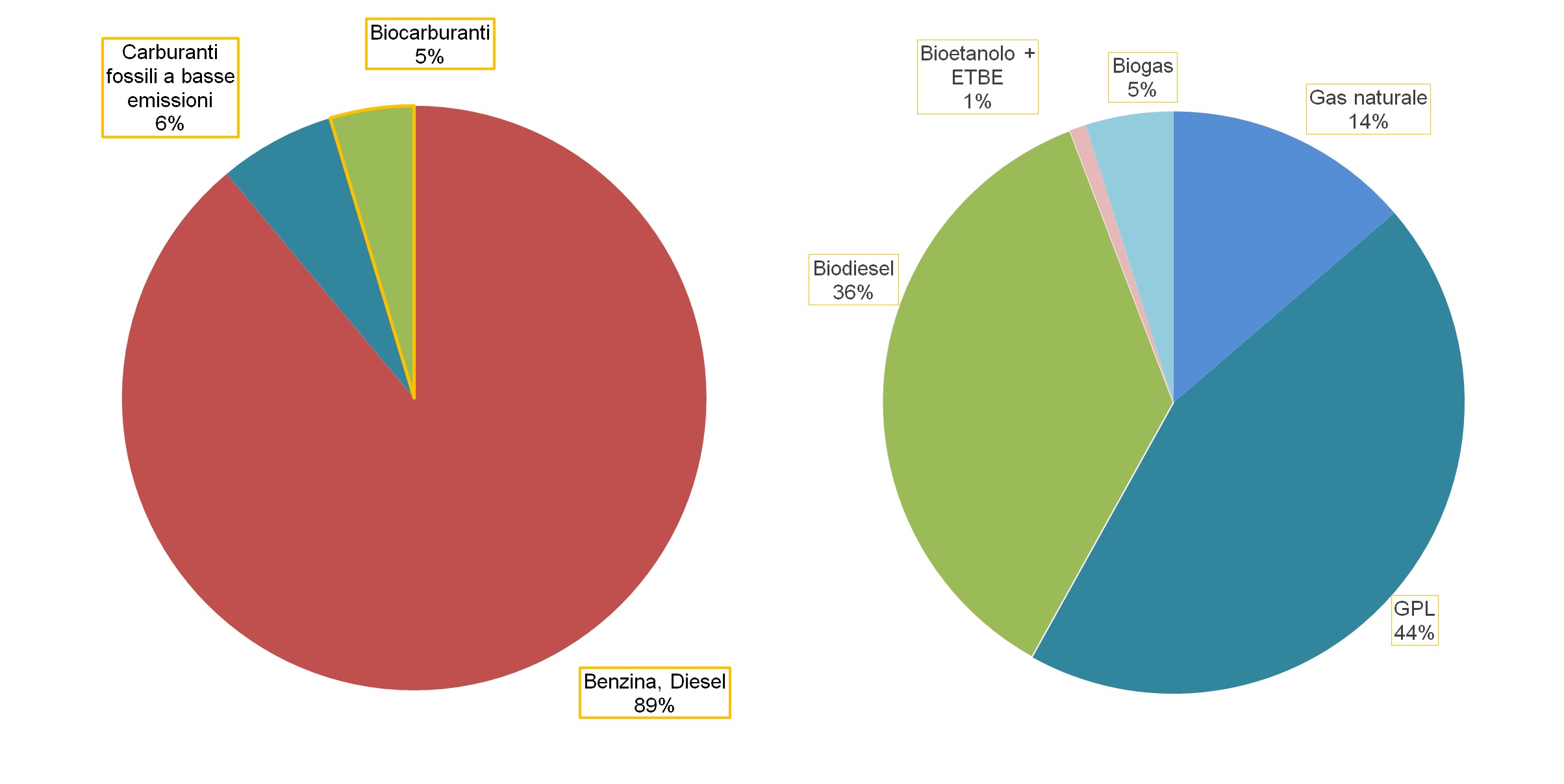 In Italia, la diffusione di carburanti a minor impatto ambientale è tuttavia discreta rispetto ad altri paesi europei. La parziale esenzione dalle accise per questi carburanti ha contributo alla loro diffusione. Un altro elemento è la possibilità di circolazione nei centri urbani durante i periodi di blocco del traffico per le autovetture alimentate a GPL e gas naturale. L’Italia presenta un parco relativamente consistente di veicoli ad alimentazione alternativa rispetto alla media europea; l'incidenza dei biocarburanti sul consumo totale è ancora bassa, si tratta di prodotti in buona parte importati o fabbricati con materia prima importata. Nel 2023, sul complesso dei consumi energetici dei carburanti a minore impatto ambientale utilizzati, il peso dei consumi dei biocarburanti è pari a circa il 42,2%, mentre il gas naturale ne rappresenta il 12,4% e il GPL la quota preponderante del 45,4% (Figura 1).