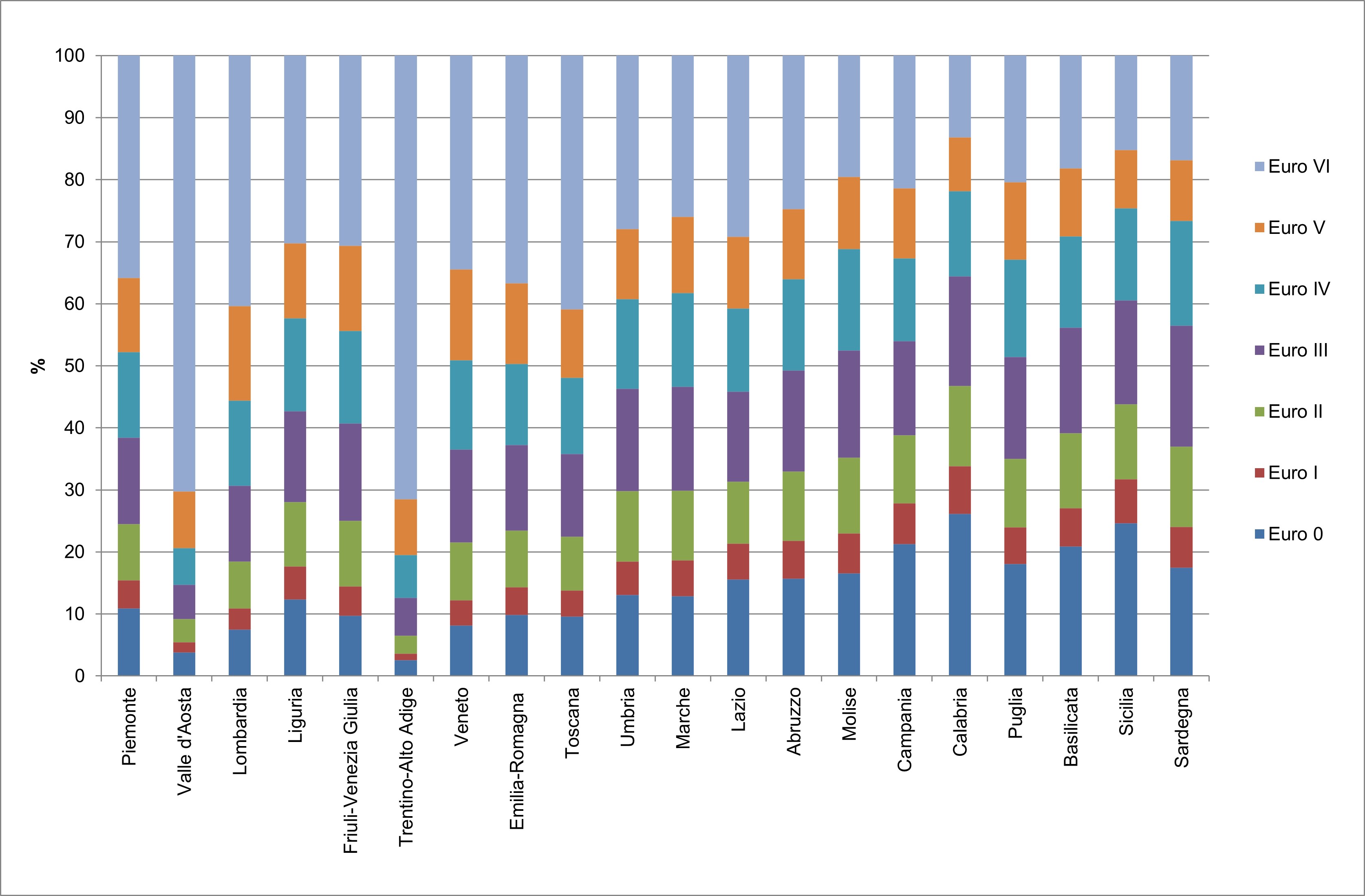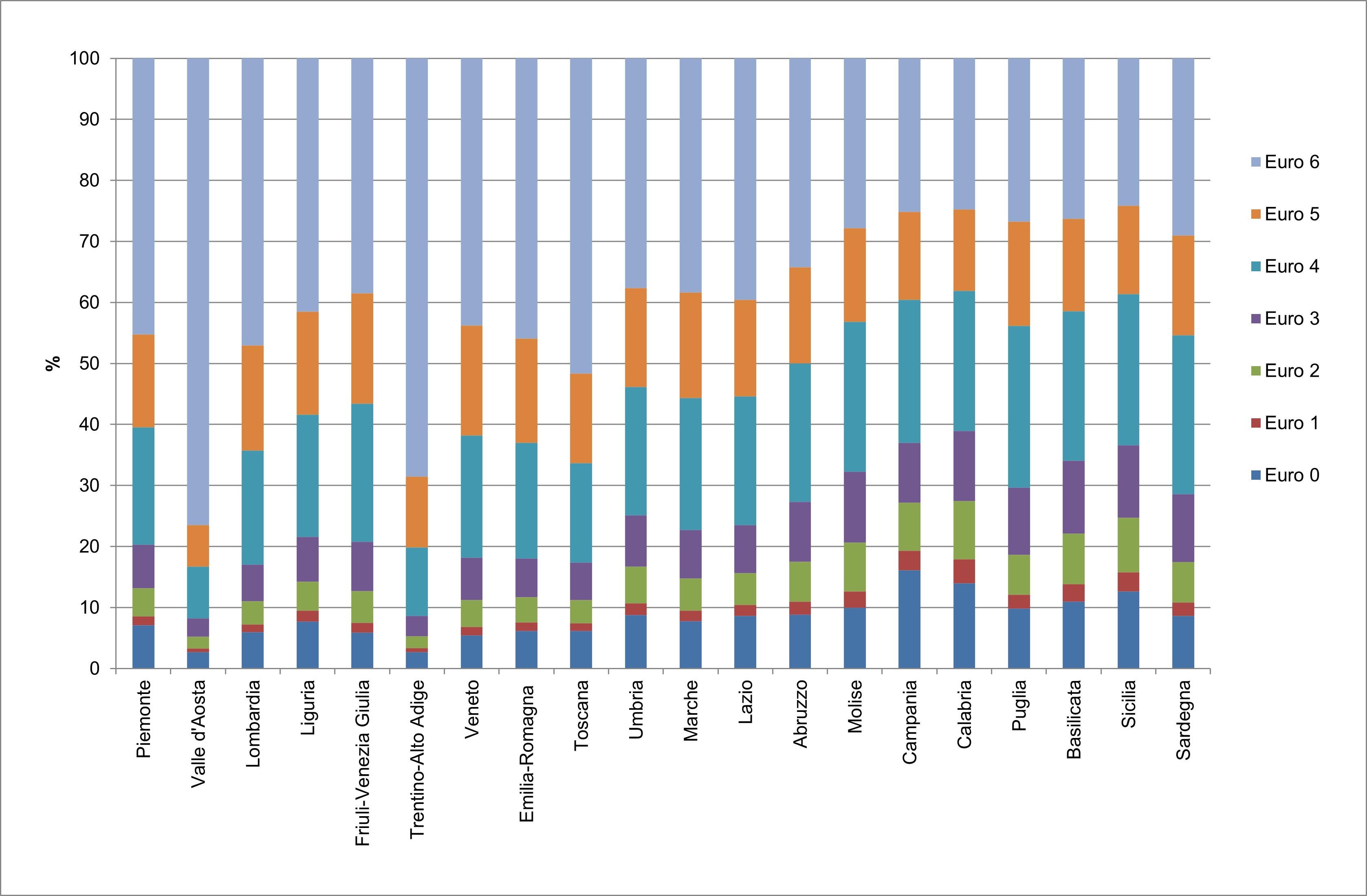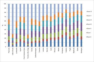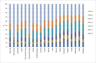 La Figura 1 mostra la quota parte dei veicoli circolanti a livello nazionale conformi a standard ambientali restrittivi. Il dato sul rinnovo e sull’adeguamento tecnologico del parco veicolare è correlato al reddito medio della popolazione. La diffusione dei veicoli più nuovi non è omogenea a livello nazionale.
