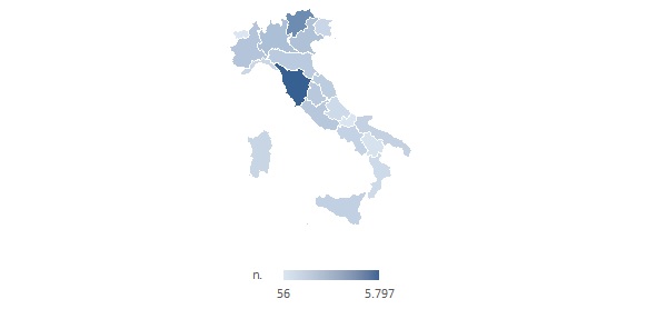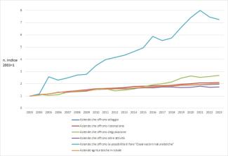 Nel 2023, le aziende agrituristiche autorizzate hanno raggiunto le 26.129 unità, con un incremento dell'1,1% rispetto all'anno precedente. L'81% delle aziende offre servizi di alloggio, mentre il 36% combina alloggio e ristorazione (Tabella 1 e Tabella 3). La distribuzione geografica conferma una maggiore concentrazione nelle regioni Toscana e Trentino-Alto Adige in particolare nella provincia autonoma di Bolzano. Tra il 2022 e il 2023 Valle d’Aosta, Liguria e Abruzzo hanno registrato le flessioni maggiori in termini di numero di aziende agrituristiche.
