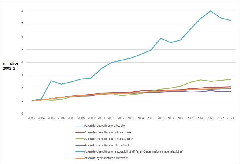 Dal 2003 al 2023, il settore degli agriturismi evidenzia una crescita costante, con un incremento del 101% nel numero di aziende. Le strutture con alloggio sono aumentate del 97%, gli agri-ristori del 110%, mentre le aziende con degustazione sono più che raddoppiate, passando da 2.500 a oltre 6.500 unità (Tabella 1). Le attività di osservazione naturalistica sono cresciute da 224 nel 2003 a 1.627 nel 2023, evidenziando un forte interesse per le esperienze a contatto con la natura.